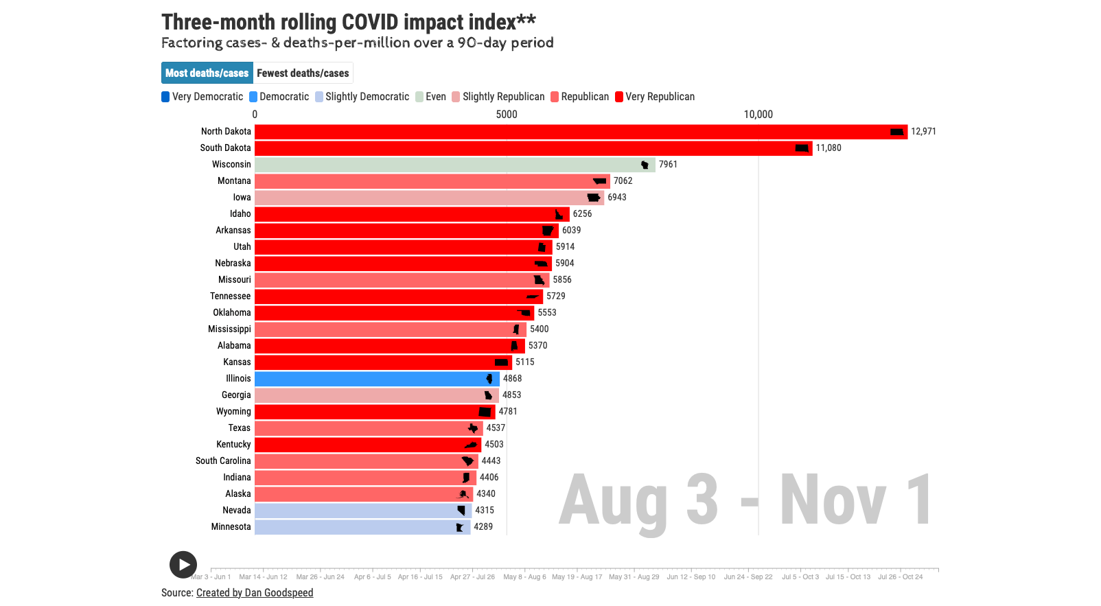 Animated bar graph chart of an index factoring both cases and deaths, over a rolling 90-day period