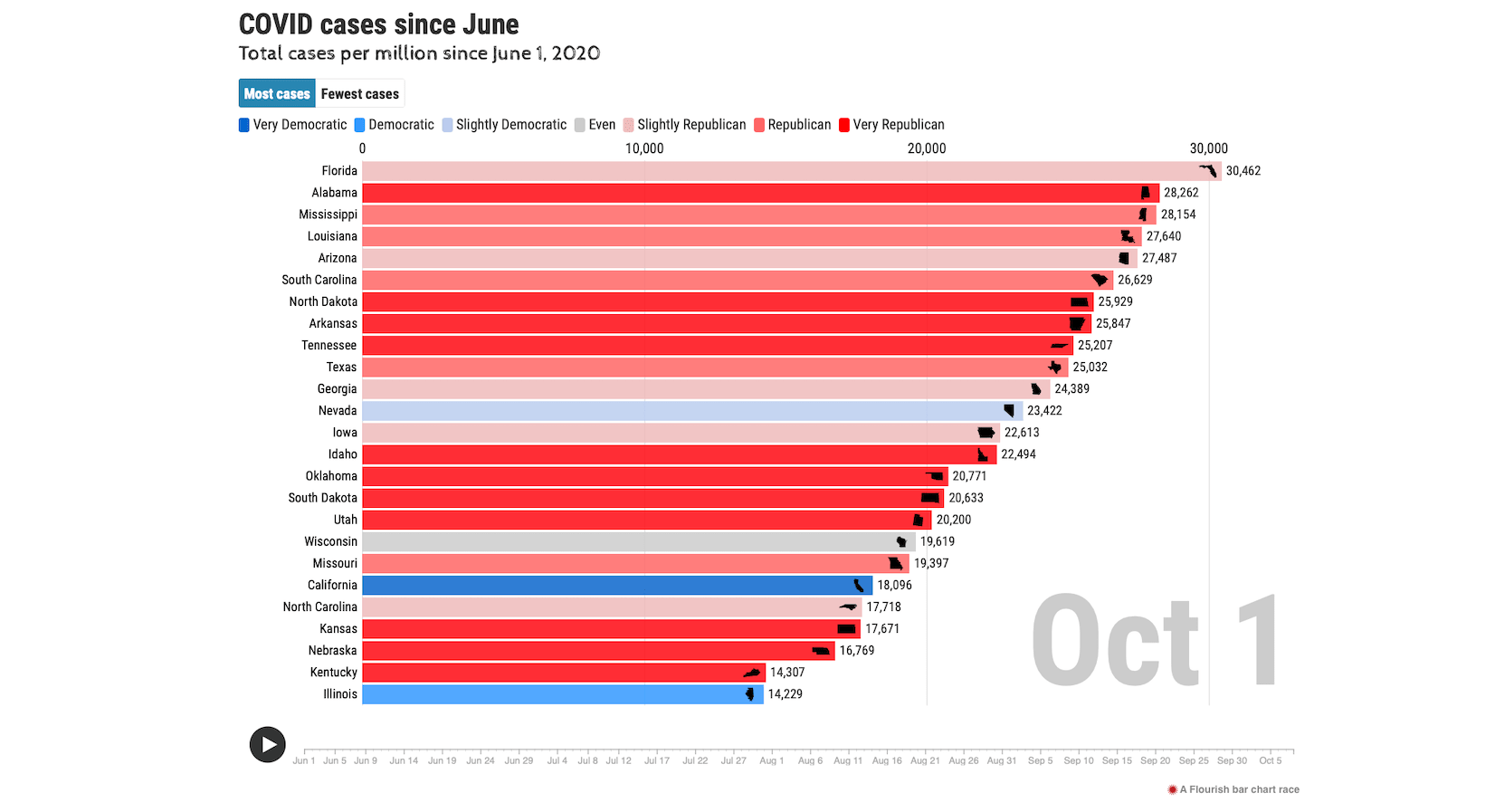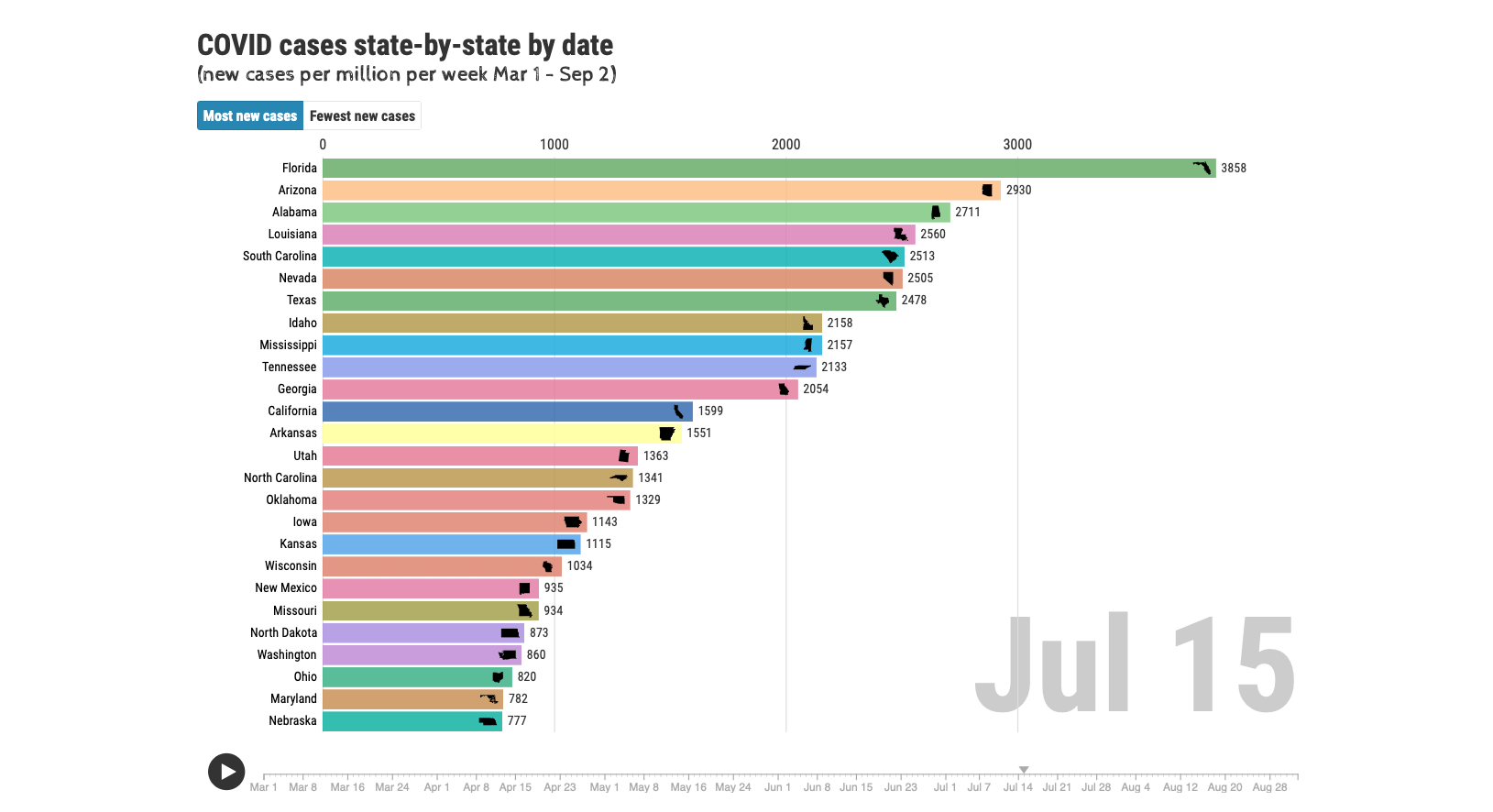 Animated bar graph chart of total COVID cases, state-by-state, since June 1