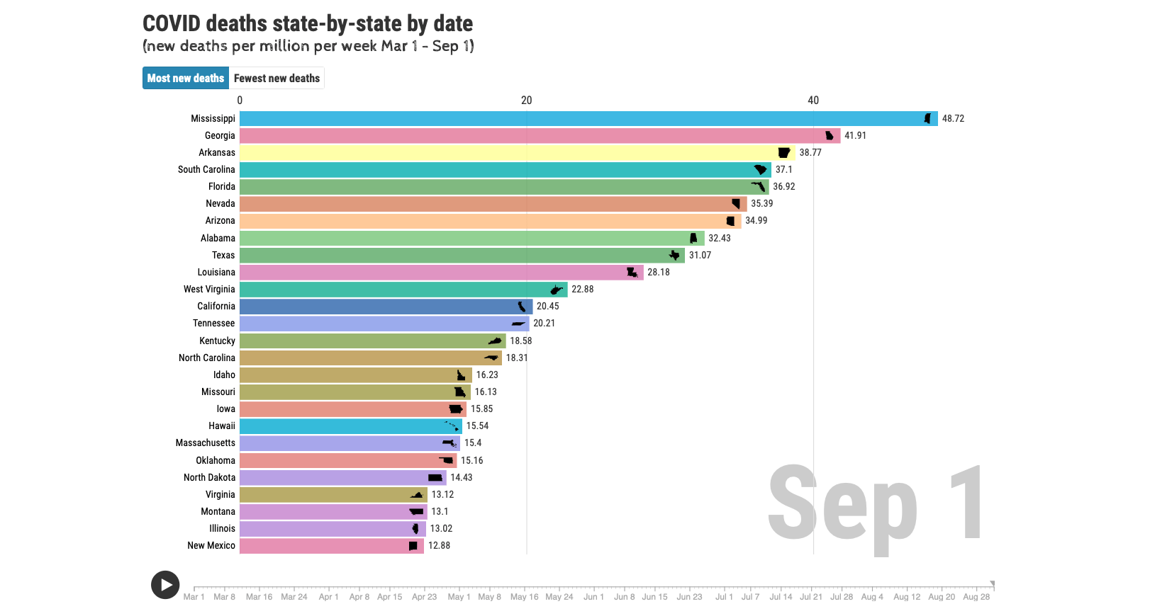 Animated bar graph chart of new weekly COVID deaths, state-by-state