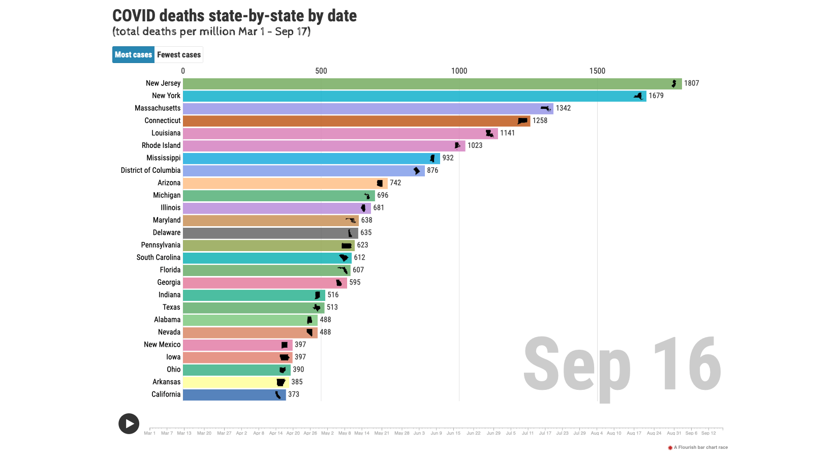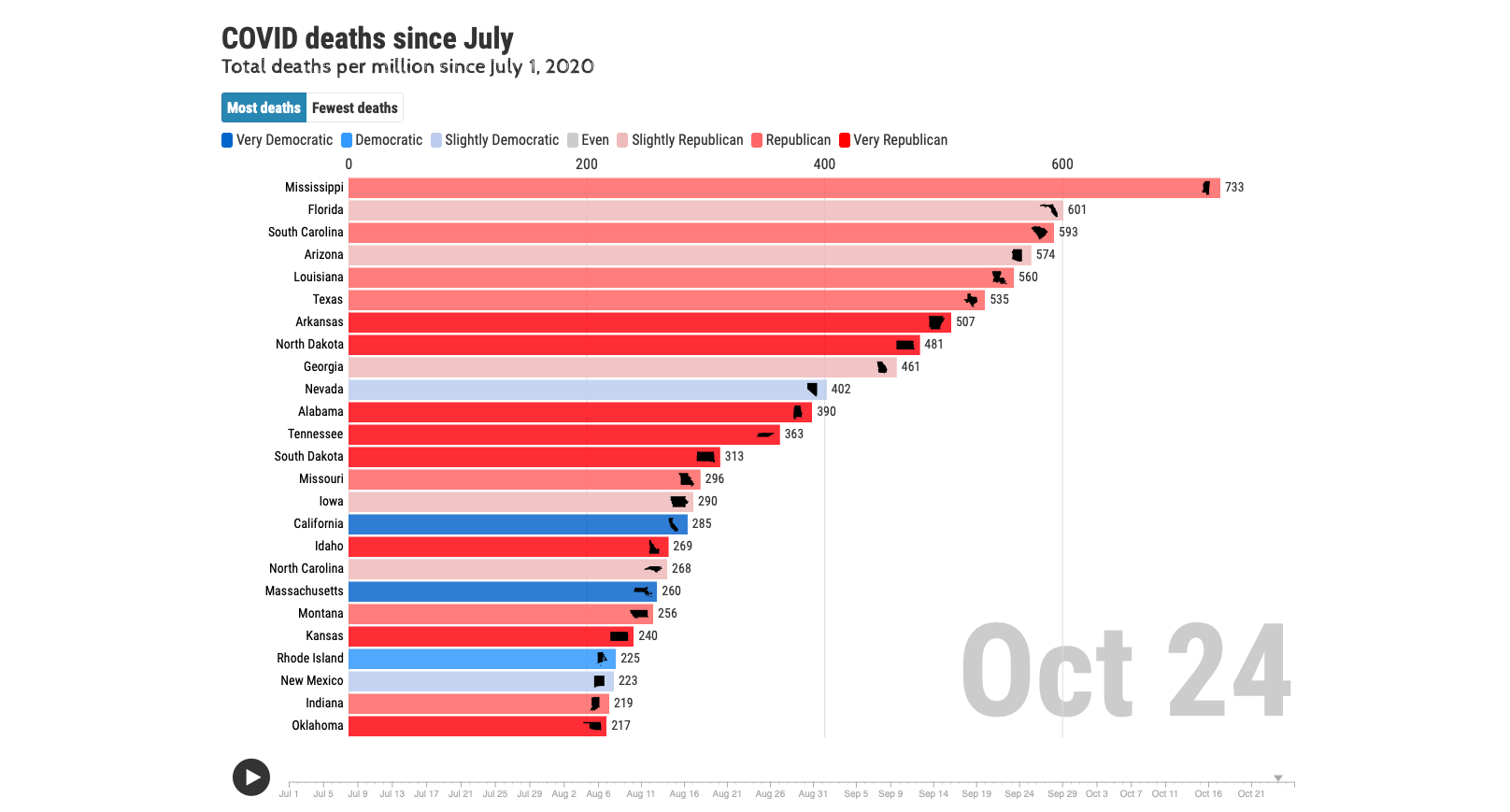 Animated bar graph chart of total COVID deaths, state-by-state, since July 1