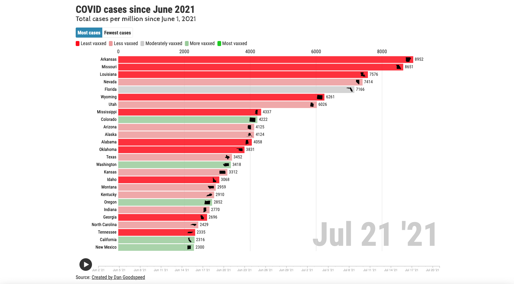Animated bar graph chart of total COVID cases since June 2021, cross-referencing state vaccination rates