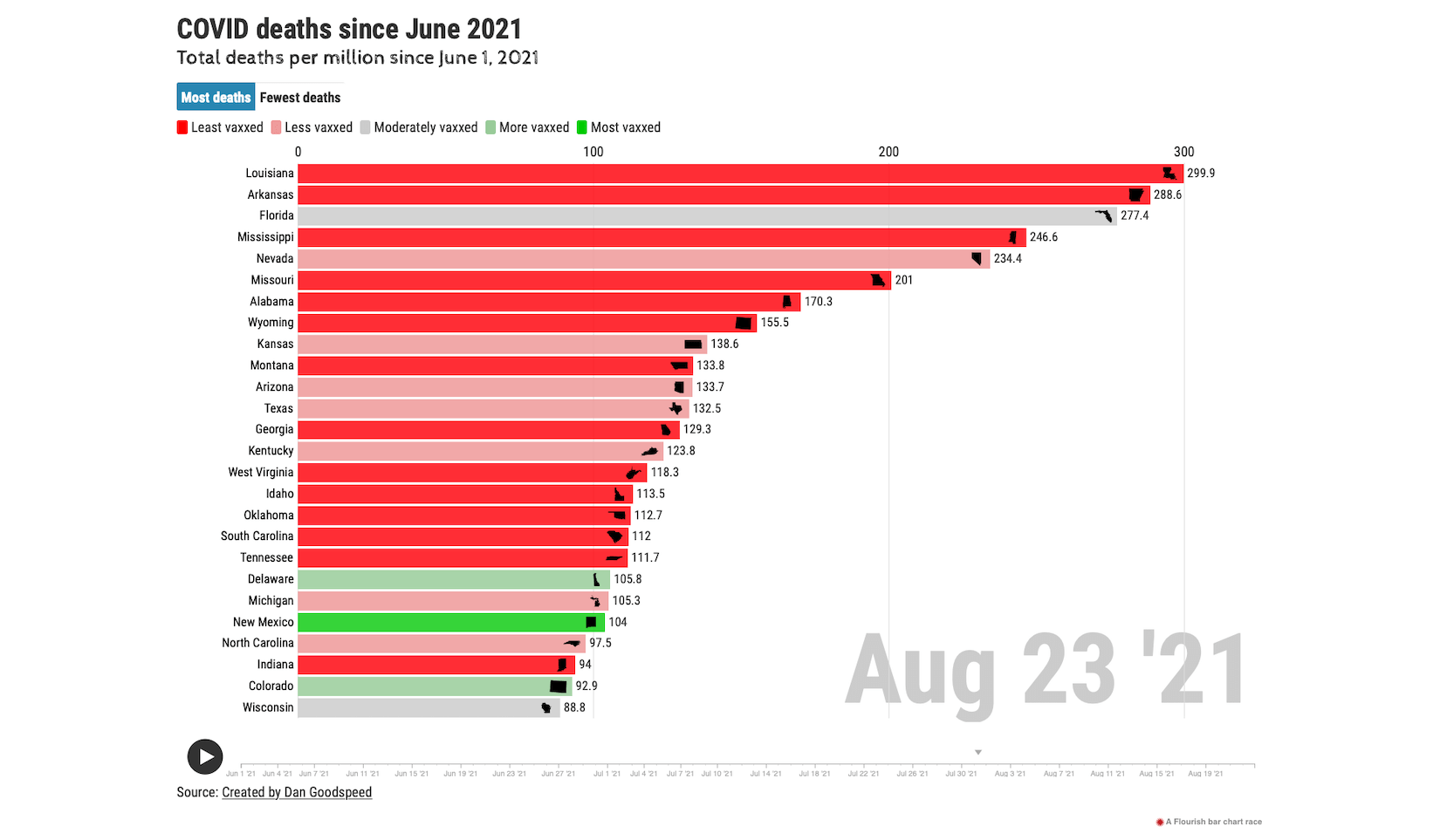 Animated bar graph chart of total COVID deaths since June 2021, cross-referencing state vaccination rates